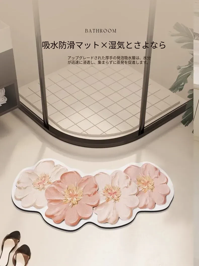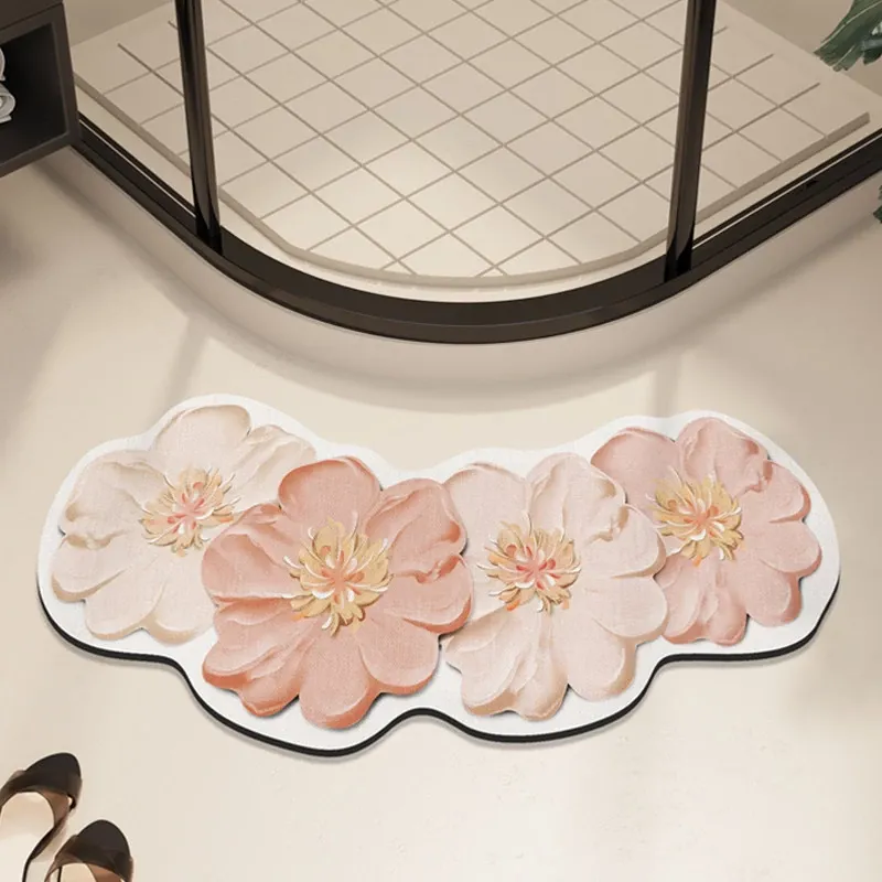 淡いピンクの花柄・珪藻土マット-アーチ形状