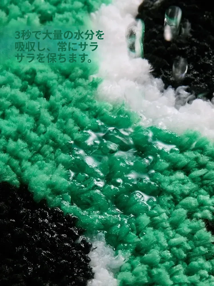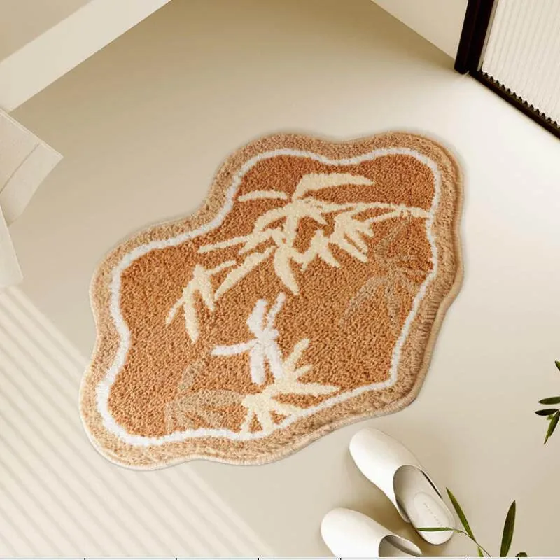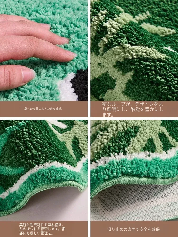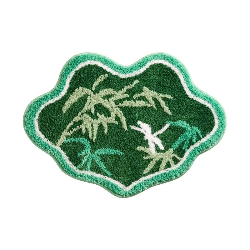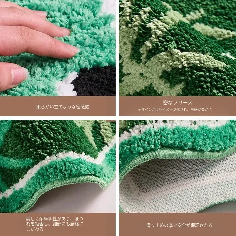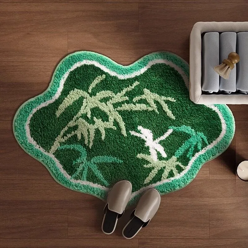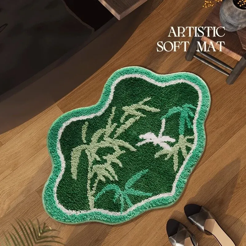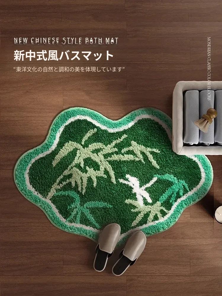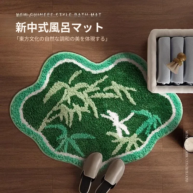 新中式デザインの吸水バスマット、グリーンのユニークな形状、フロッキング加工で滑り止め効果抜群!トイレやシャワールームに最適な速乾性カーペットで、清潔感あふれる空間を演出します。