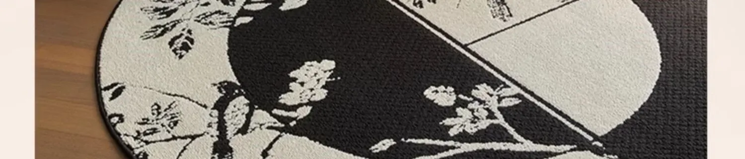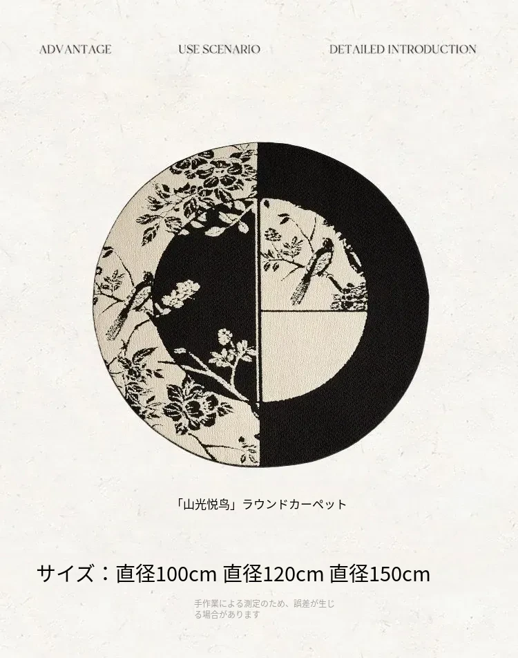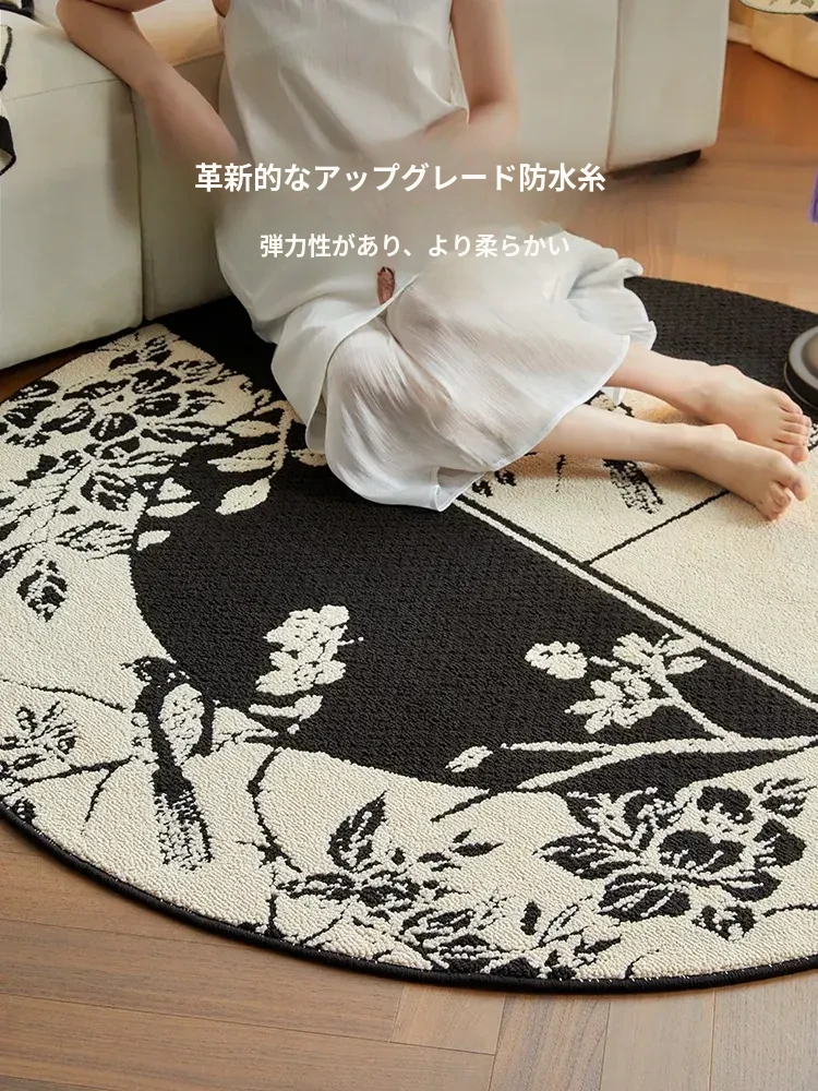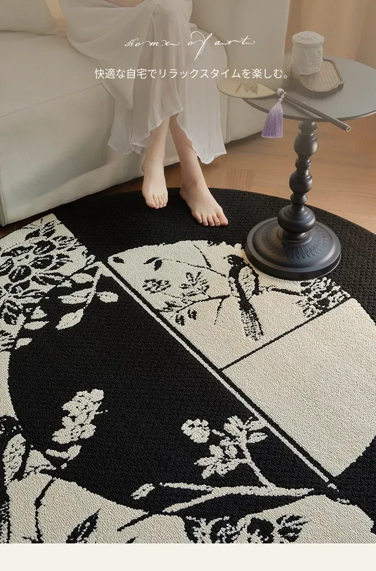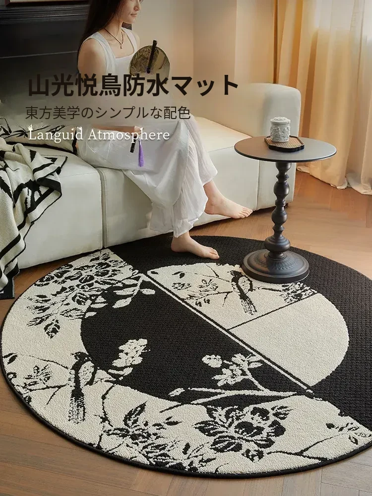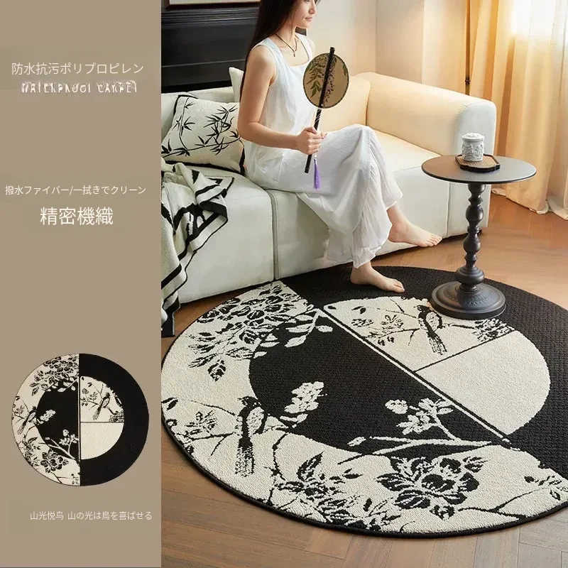 新中式デザインの防水・汚れ防止ラウンドカーペット|ブラック&ホワイトのレトロスタイル|リビングやベッドサイド、ソファやテーブルの下に最適|お手入れ簡単で耐久性抜群のクッションマット!