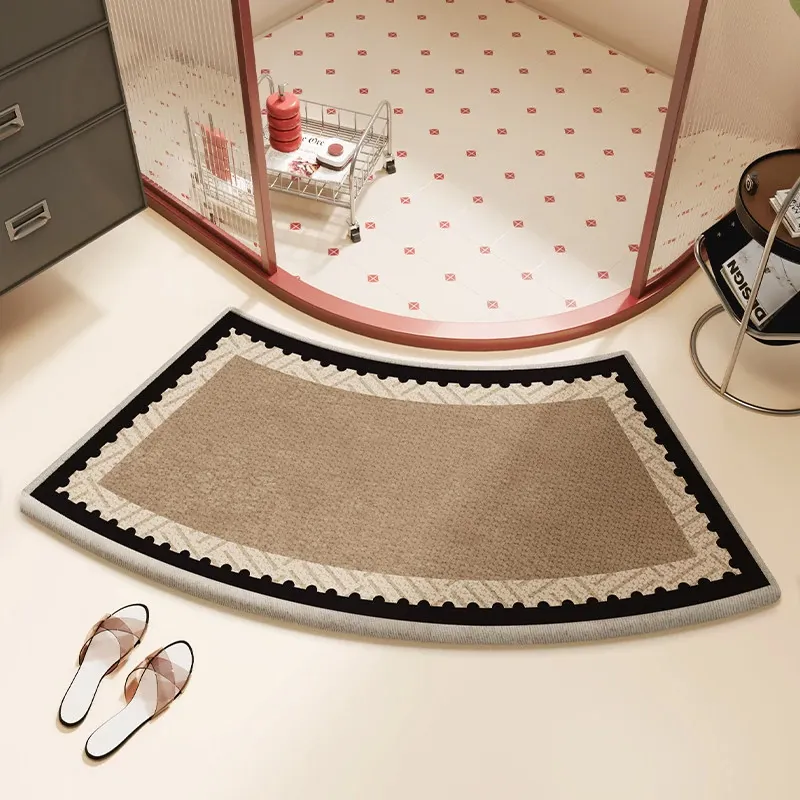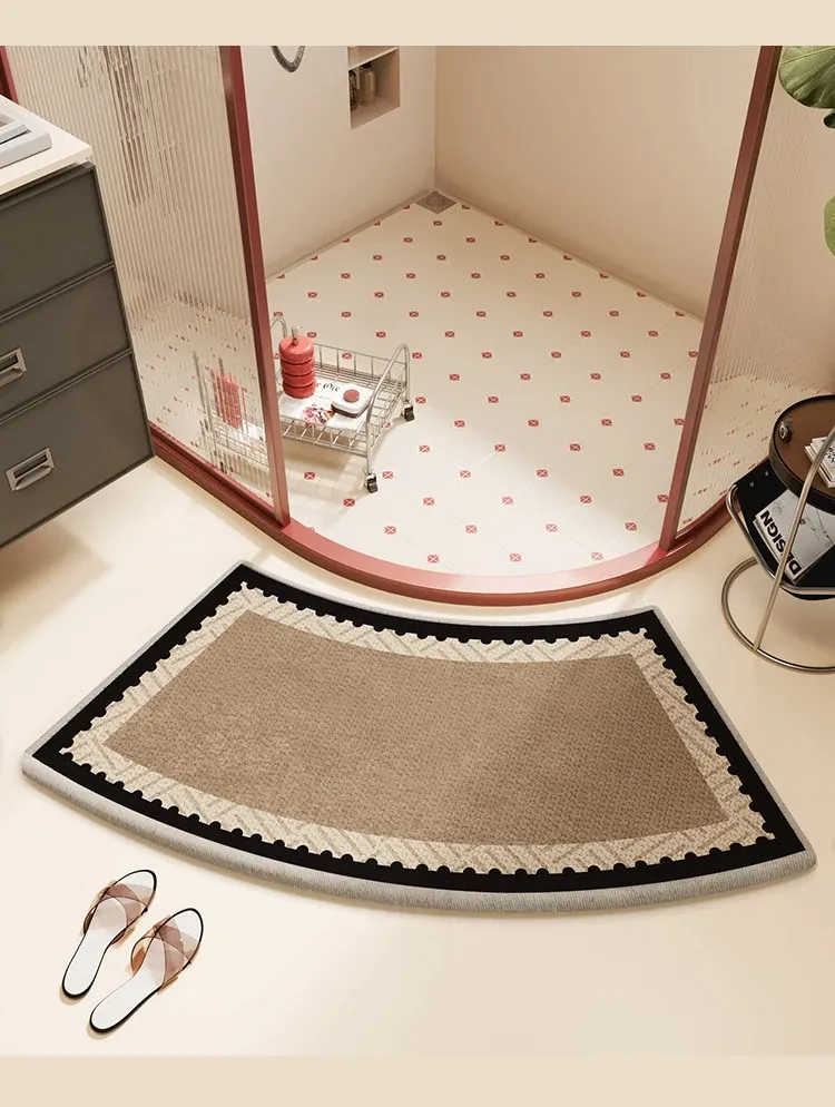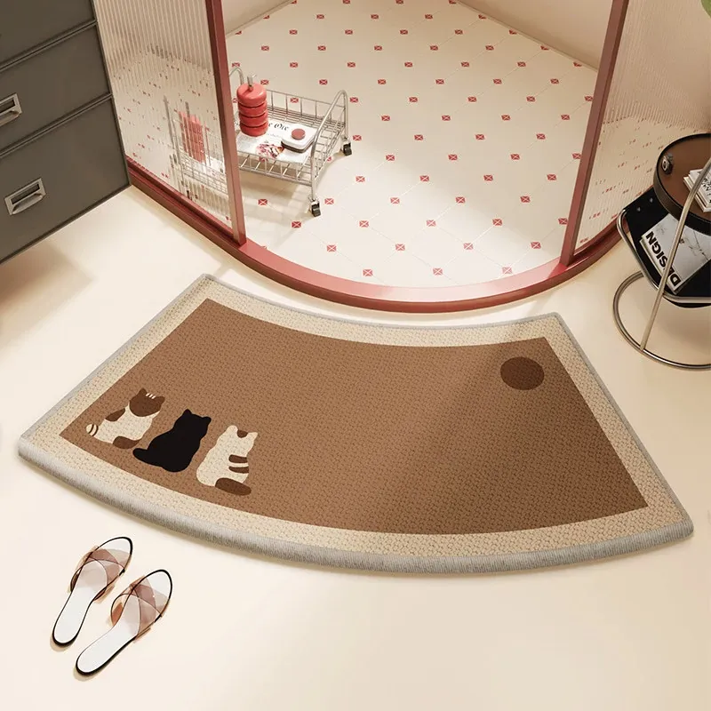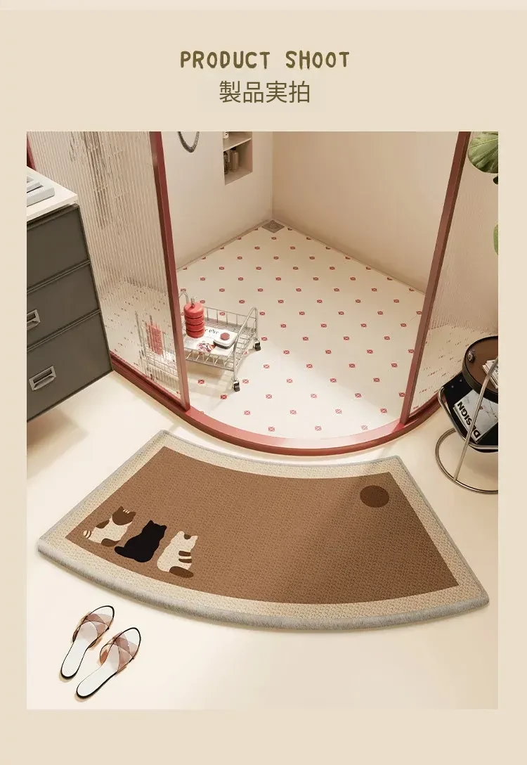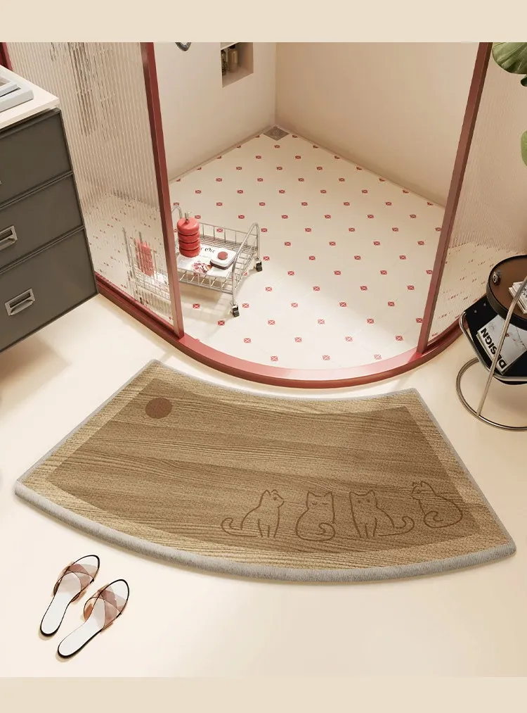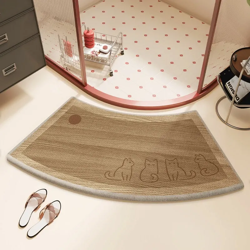 木目調の曲線形バスルームマット - 吸水性抜群で滑り止め機能付き!ファンシーなデザインで、シャワールームやトイレの入口にぴったりのカーペット。可愛らしいキャラクターで、毎日のバスタイムを楽しく演出!