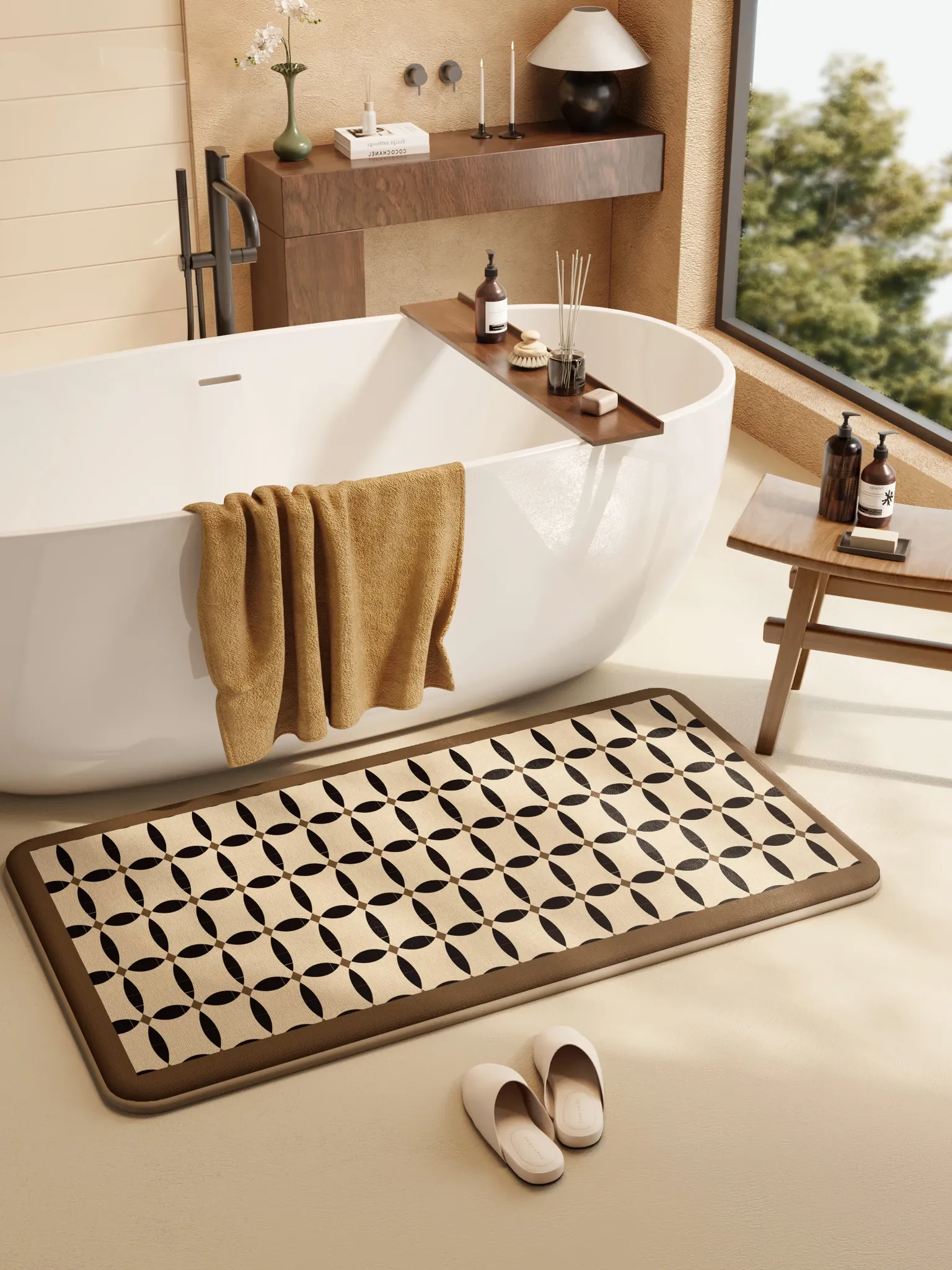 アメリカンスタイルのバスルームマット!デザイン性と機能性を兼ね備えた珪藻土吸水速乾マット。トイレやバスルームの入り口に最適、滑り止め機能付きで安全安心。おしゃれで実用的な足元を演出します!