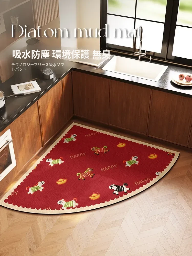 マ年のキッチン用扇形コーナー装飾マット - 新年にぴったりな赤いシリカゲル吸水防滑フットマット!快適な使用感とお洒落なデザインで、あなたの空間を華やかに演出します。