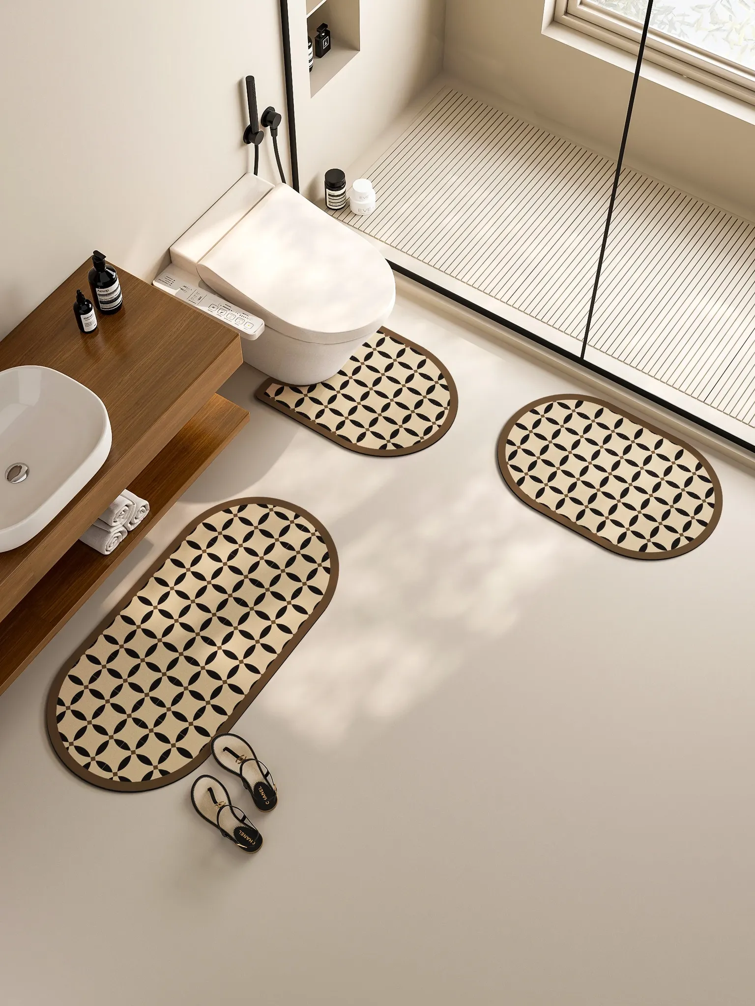 新中式デザインのバスルームマット!優れた吸水性と冬の寒さから守る防滑性を兼ね備えたトイレ用フロアマット。ふんわりとした植毛素材で、快適な足元を実現します。おしゃれで機能的なバスルームを演出!