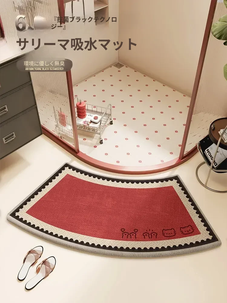 赤い扇形のバスルームマット - 吸水性抜群!トイレの玄関マットにも最適なシリカゲル製の踏み台マット。あなたのバスルームをスタイリッシュに彩ります!