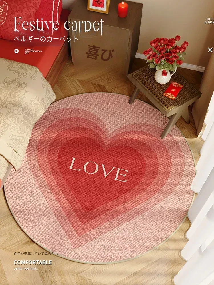 結婚用ラウンドカーペット!エレガントな赤色の婚約カーペットで、リビングやベッドルームを華やかに演出。『喜』の字が入った厚手のフットマットで、特別な日をより思い出深く。おしゃれで快適な空間作りに最適です!