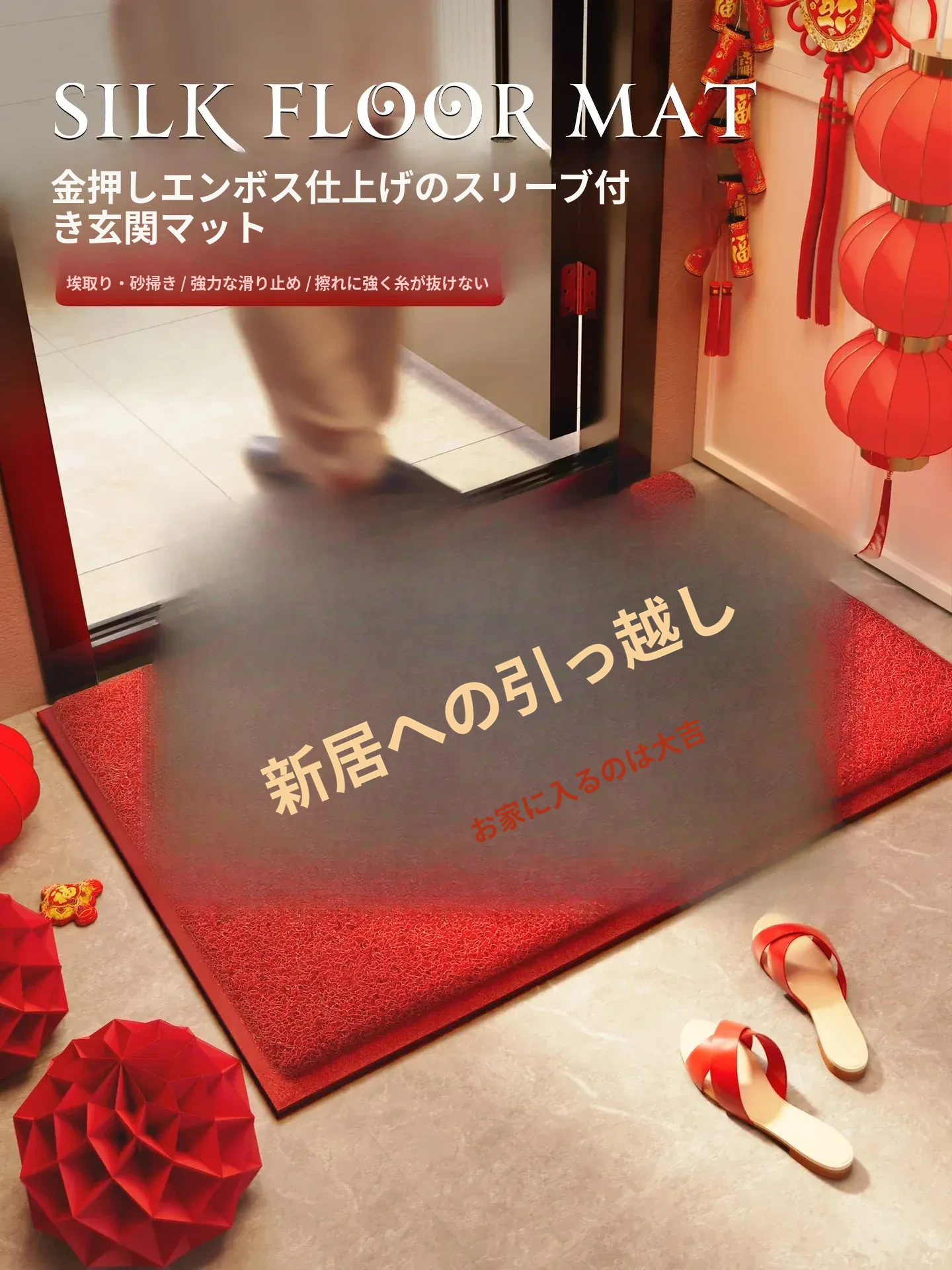 新居祝いに最適!高級感溢れるレッドの玄関マット - 美しいデザインでお迎えする、引越しにぴったりのスリッパマット!心地よい足触りとお祝いの雰囲気を演出します。