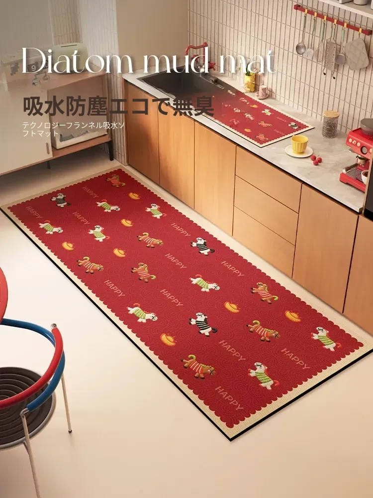 2026年新作!おしゃれな赤いキッチンマット、シリカゲル吸水マットで滑り止め&油汚れ防止!馬年にぴったりの縦長デザインで、明るく楽しいキッチン空間を演出します!