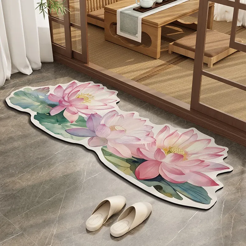 新中式デザインのユニークな蓮の形の吸水性シリカゲルマット - 玄関、キッチン、バルコニーに最適なロングストライプラグ!快適さとスタイルを両立した必見アイテム!