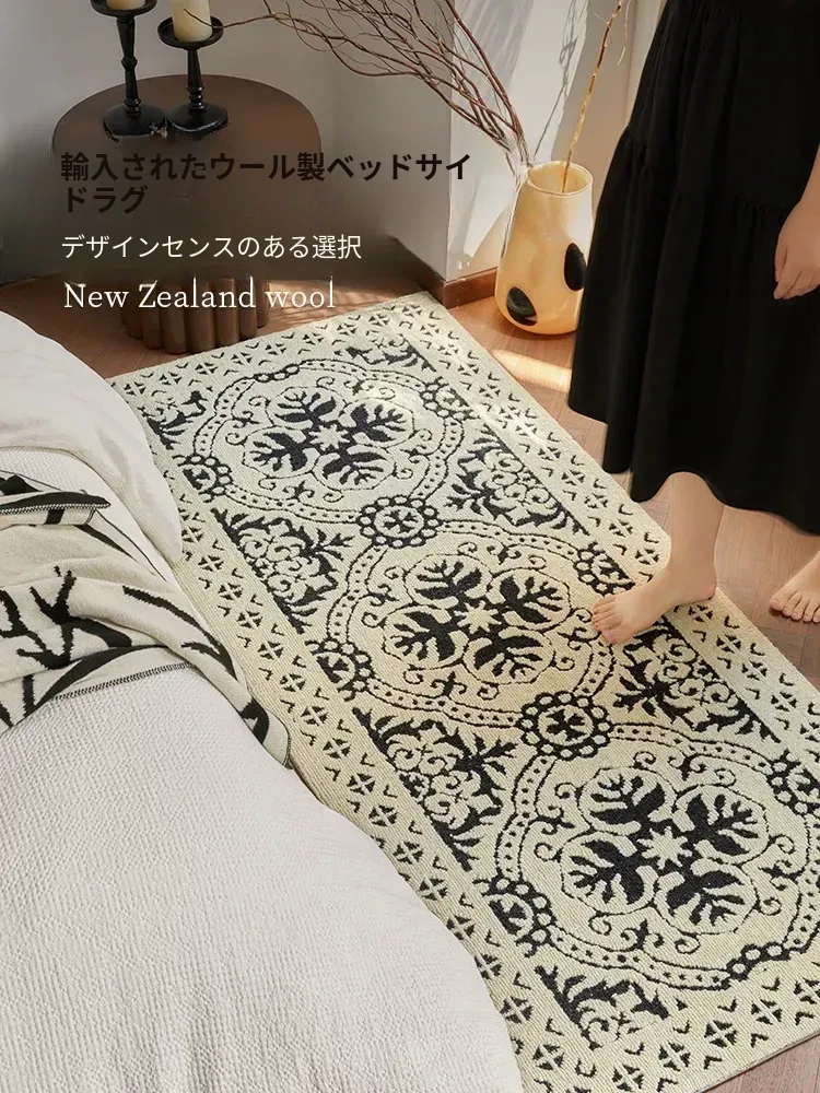 フレンチビンテージスタイルのベッドサイドラグ - 高級感溢れる厚手ウールカーペット、滑り止め付きで、主寝室にぴったりの洗練されたデザイン。快適で上質な空間を演出します。