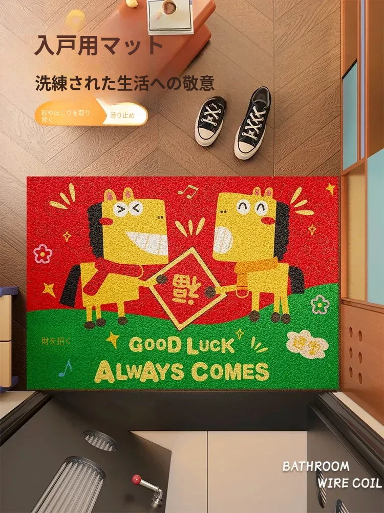 馬年の幸運を呼ぶ!赤いおしゃれな玄関マット、防滑設計で安心。カラフルなキャラクターが新年の訪問を楽しく演出します。新年を迎えるのにぴったりなドアマットです!