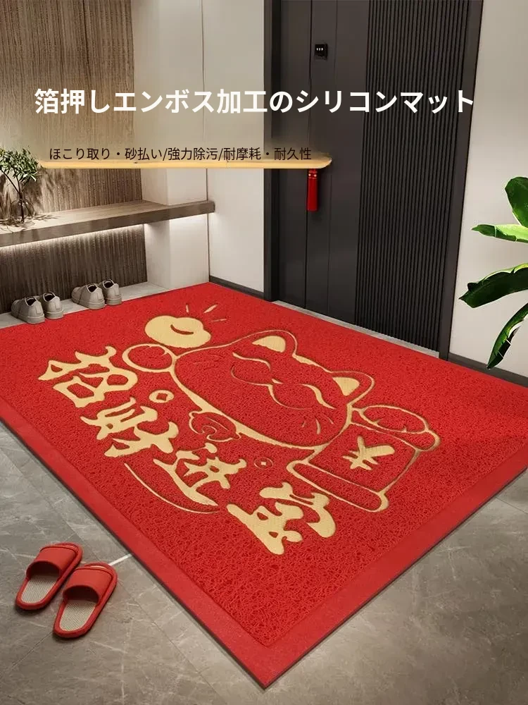 招財進宝の赤いシルク製玄関マット - 家庭用・防滑・耐汚れ、大門口に最適なフットマットで運気をアップ!