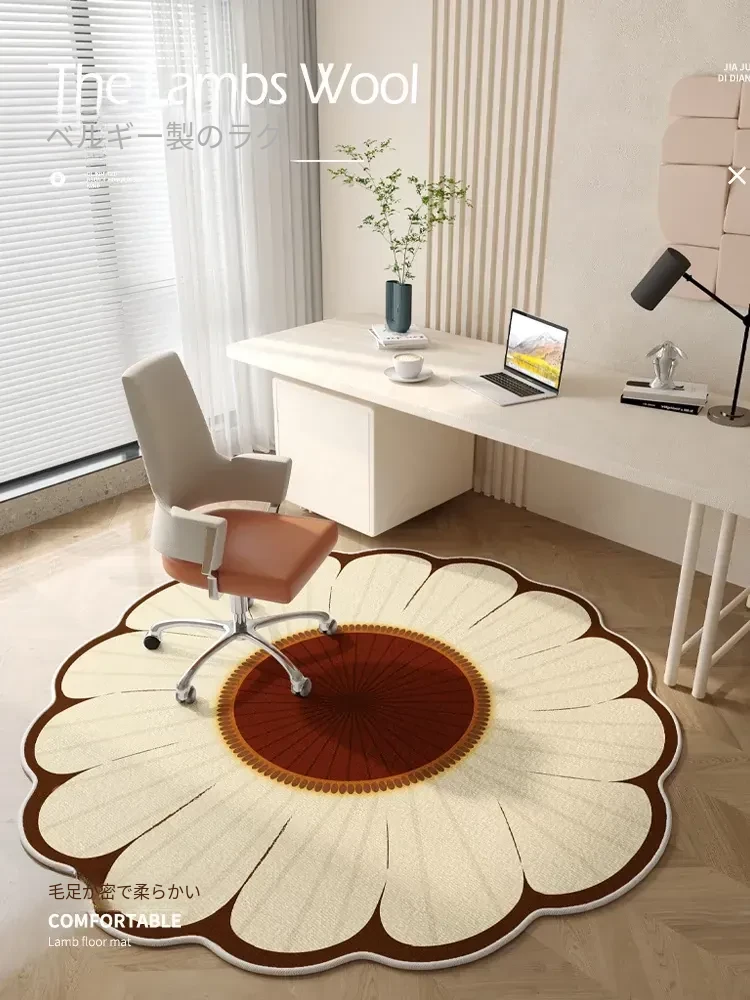 太陽花デザインの不規則形状カーペット、書斎や寝室にぴったり!パソコンチェアやロッキングチェアを守る床保護マット。おしゃれで実用的なインテリアアイテム!